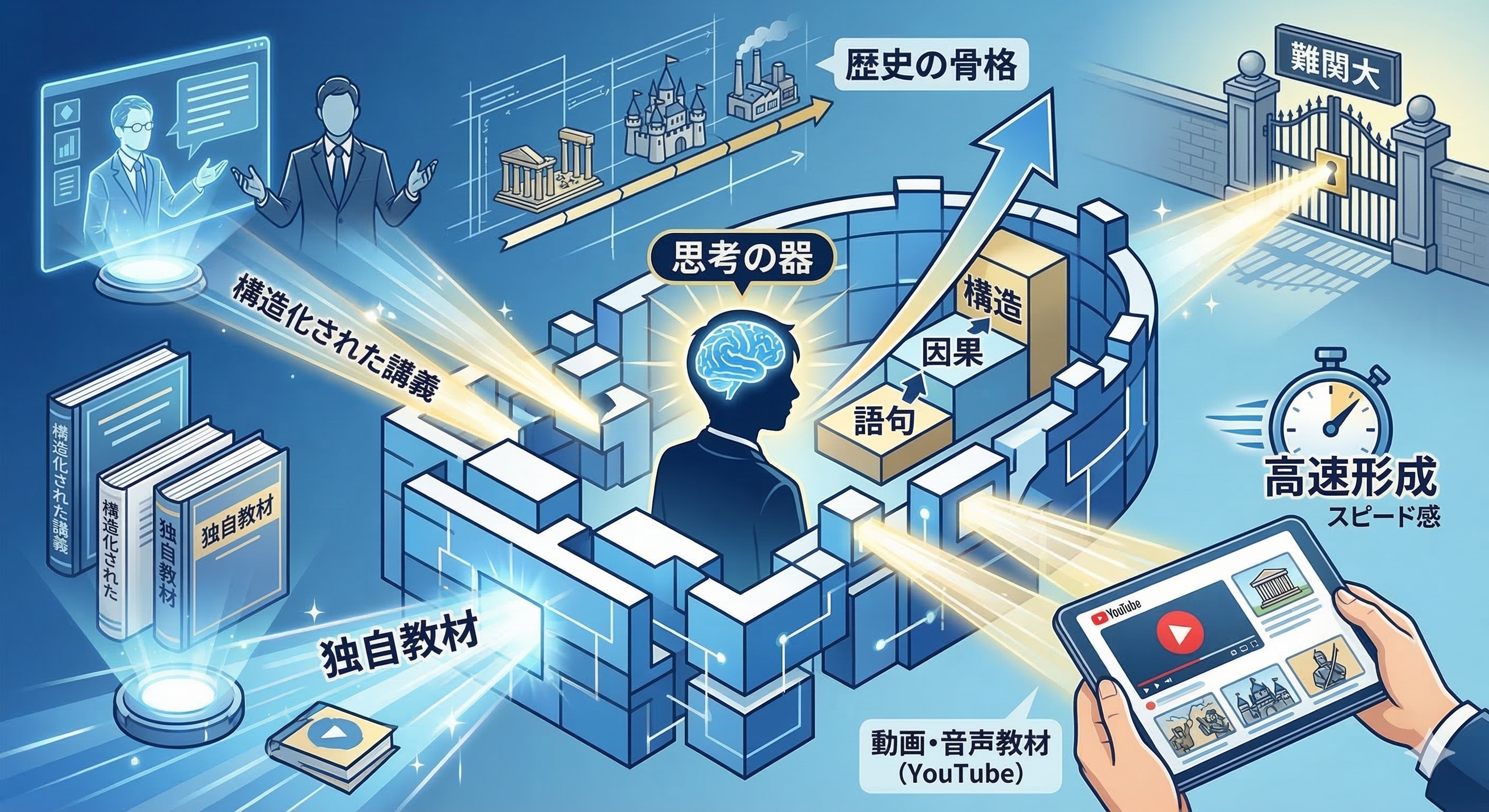 それは、日本史講師の土屋文明が大学受験をめざす生徒の理解構造・認知特性・思考パターンを分析・設計した授業を通じて、個体差による「認識のズレ」を科学的に補正し、独自教材を駆使して最短距離の学習ルートで合格へ導く未来志向型の日本史ことです。